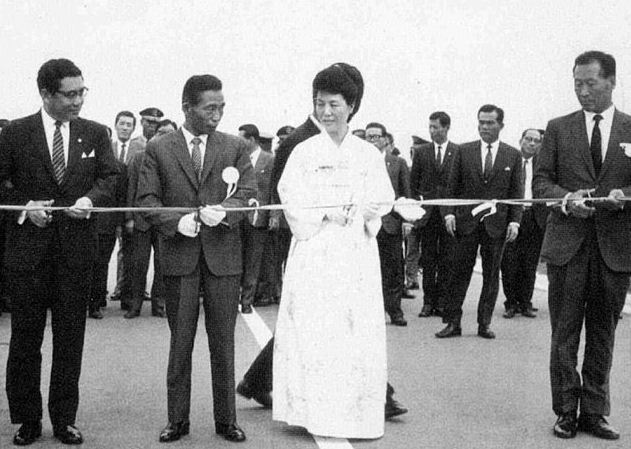 1970년 7월 경부고속도로 준공식에서 박정희 대통령과 육영수 여사가 이한림 당시 건설부 장관(맨 왼쪽), 정주영 현대건설 회장(맨 오른쪽)과 함께 테이프 커팅을 하고 있다