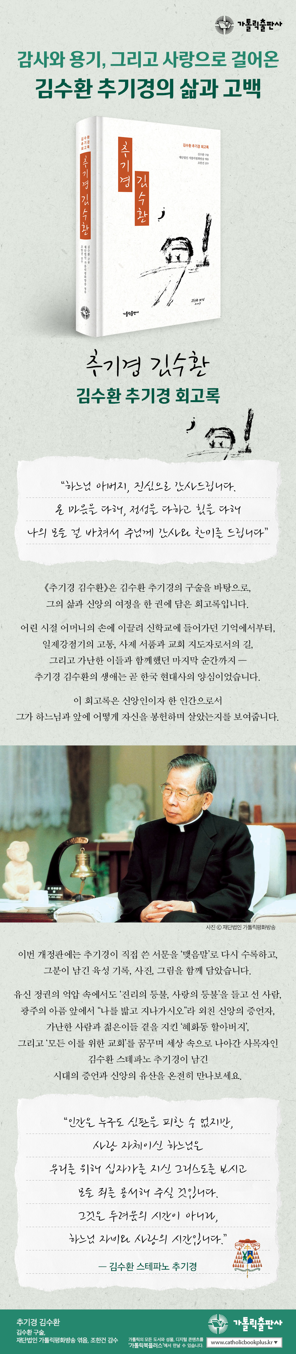 "너희와 모든 이를 위하여" 김수환 추기경의 마지막 육성 기록 한국 최초의 추기경이자, 현재 서울대교구 시복시성위원회가 시복시성 예비 심사 진행 중인 ‘하느님의 종’ 김수환 추기경. 그의 생애를 담은 책이 새롭게 개정판으로 출간됐습니다. 혼란스러운 시대일수록 큰 어른의 목소리가 필요하다는 점에서, 그의 삶과 생각은 오늘날 독자에게 여전히 깊은 울림을 전합니다. 《추기경 김수환》은 김수환 추기경이 남긴 유일한 회고록으로 그의 삶과 신앙, 한국 현대사를 통과하며 품었던 생각들이 차분히 담겨 있습니다. 책에는 어린 시절부터 일제 강점기를 보낸 소년 시절, 신학교 생활과 학도병 징집, 추기경이 되기까지의 여정이 다양한 사진과 함께 펼쳐집니다. 그가 사제의 길을 결심하기까지의 내적 갈등과 그 과정에서 느꼈던 고민이 솔직하게 드러나 있으며, 한국 최초의 추기경으로 서임되기까지의 과정과 서울대교구장 재임 30년 동안 마주한 한국 교회의 역사적 순간들이 생생히 기록되어 있습니다.