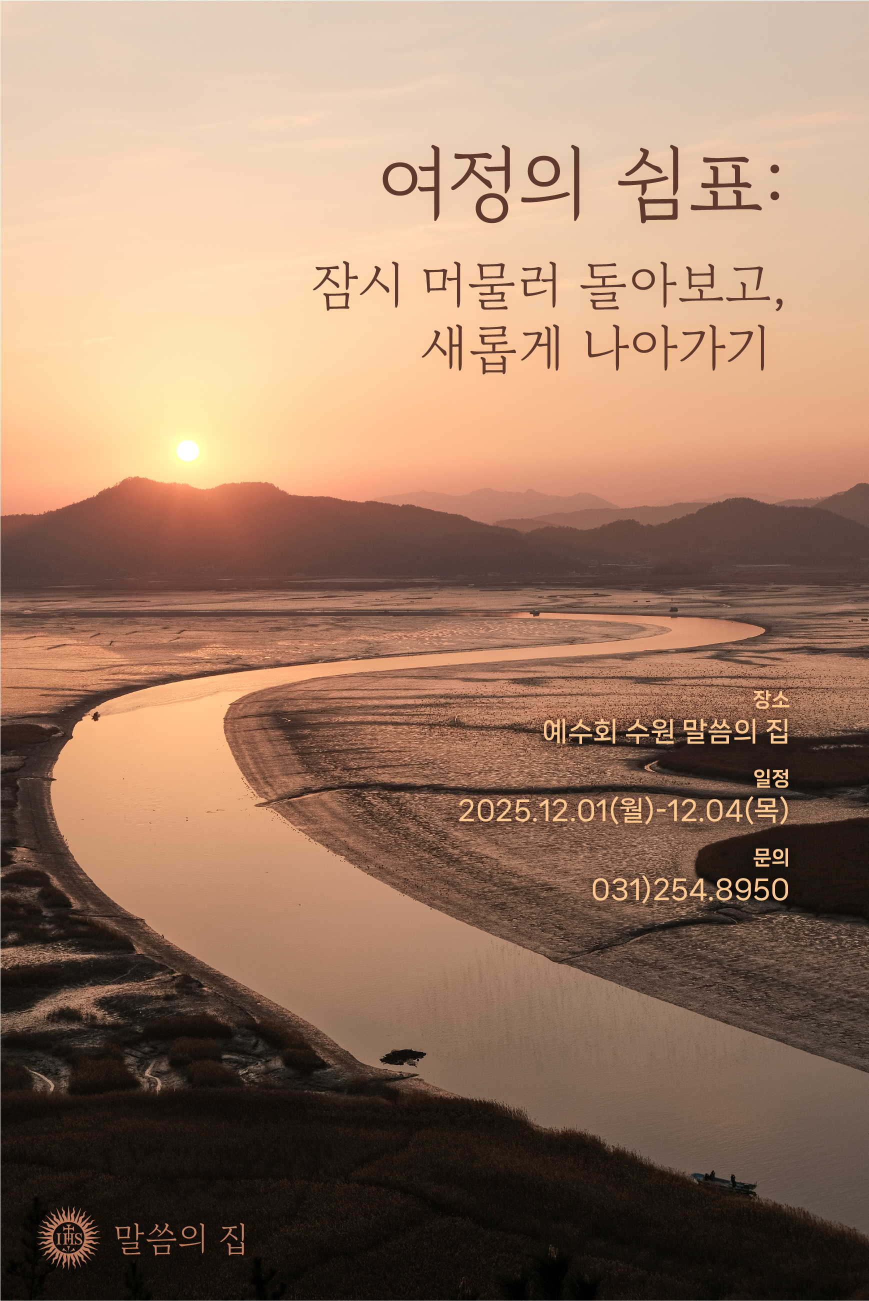 [여정의 쉼표: 잠시 머물러 돌아보고, 새롭게 나아가기] 일정: 12월 1일(월) ~ 12월 4일(목) 동반사제: 김두현 요한 신부 장소: 수원 말씀의 집 [경기 수원시 장안구 경수대로 1196-45(파장동)] 문의 및 신청 - 전화: 031)254-8950 - 카카오톡 ID : hwordsj - 카카오톡 채널 : http://pf.kakao.com/_HTwiG - 홈페이지: https://hwsj.jesuit.kr/ † 성부와 성자와 성령의 이름으로 아멘. |