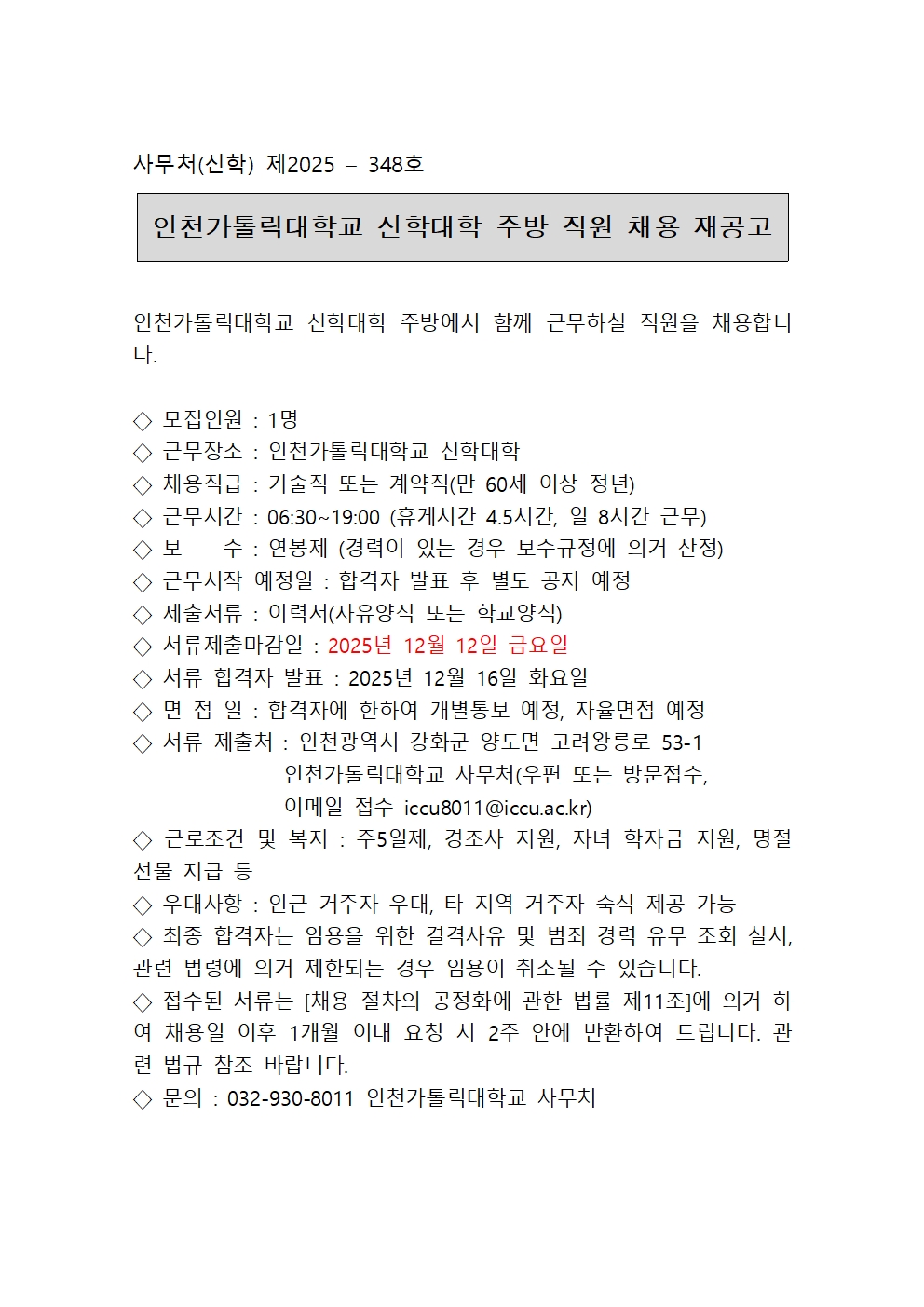 인천가톨릭대학교(강화캠퍼스) 주방 직원 채용 재공고 - 숙식제공 가능, 60세 이상 지원 가능