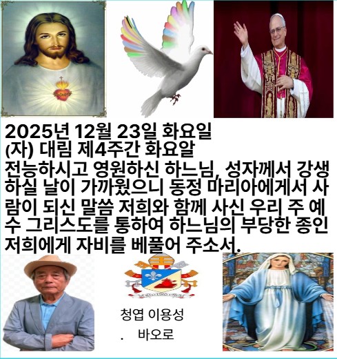 2025년 12월 23일 화요일 (자) 대림 제4주간 화요일 우리에게 한 아기가 태어나 용맹한 하느님이라 불리리니, 세상 모든 민족들이 그를 통해 복을 받으리라.