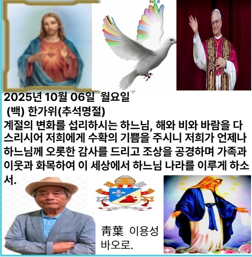 2025년 10월 6일 월요일 [(백) 한가위 오늘은 우리 민족의 큰 명절 한가위입니다. 계절의 변화를 섭리하시고 수확의 기쁨을 주시는 하느님 아버지께 감사드리며, 이웃과 서로 나누며 살아온 조상들의 아름다운 마음을 본받읍시다. 자신을 위해서만 재화를 모으는 어리석은 부자가 되지 않도록 우리도 나눔을 실천하기로 다짐하며 주님의 잔치에 참여합시다.