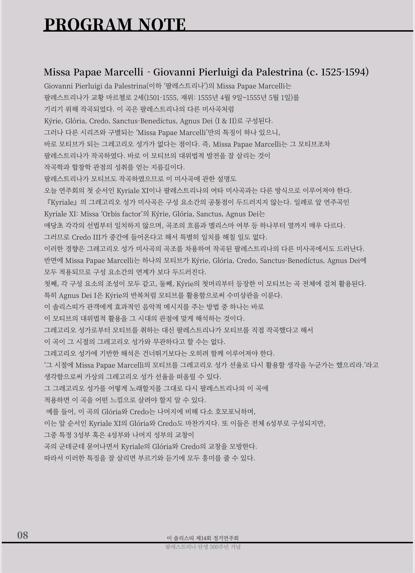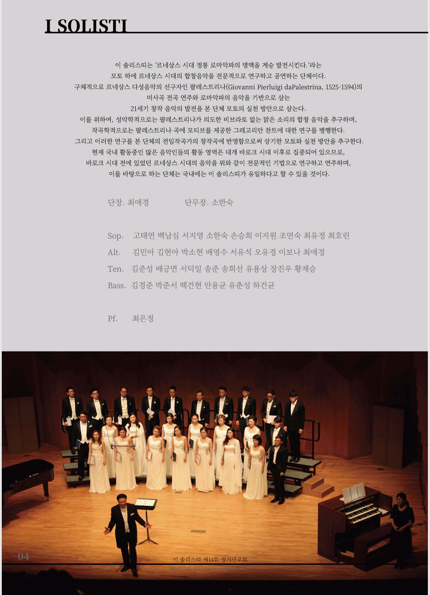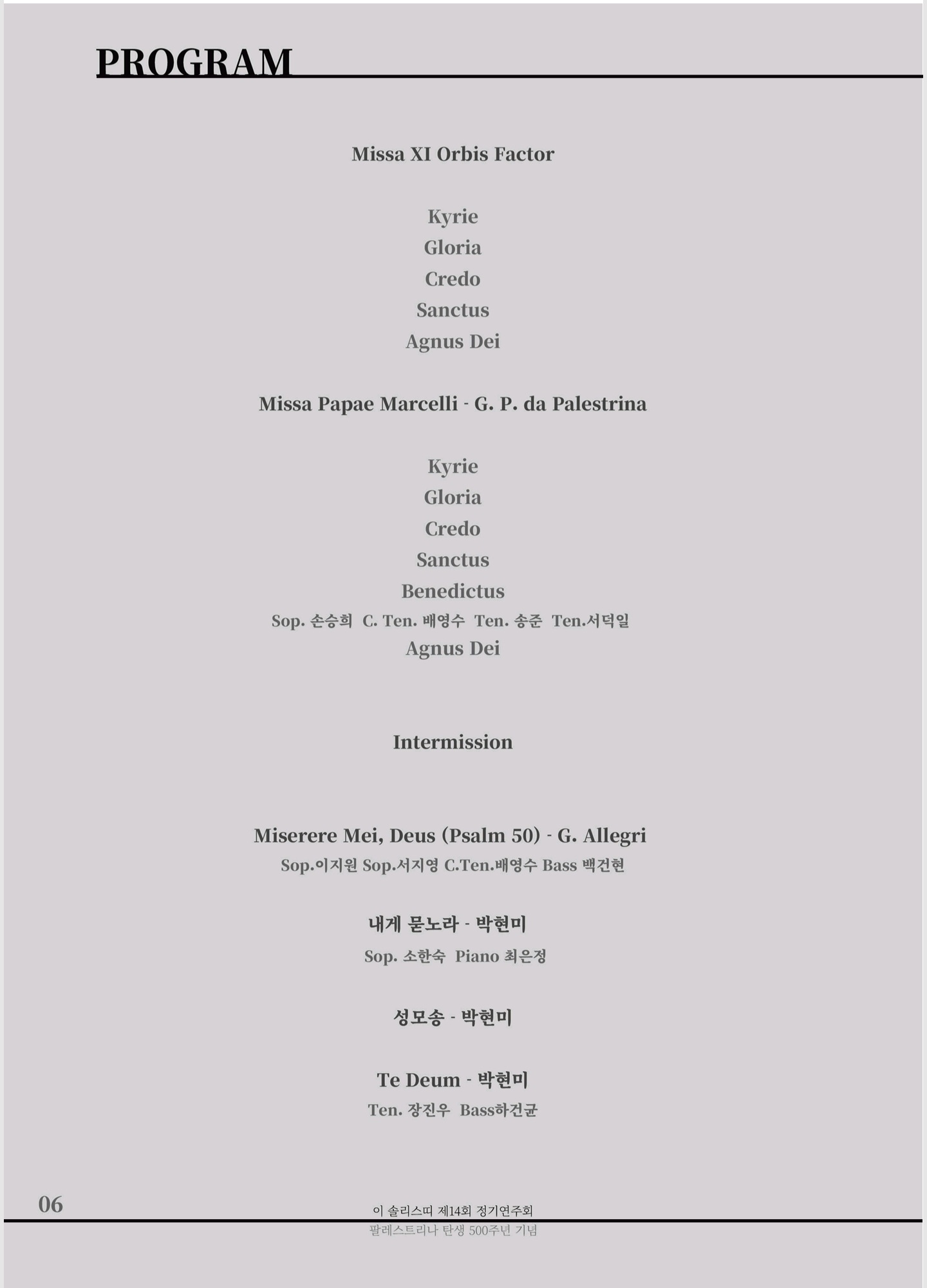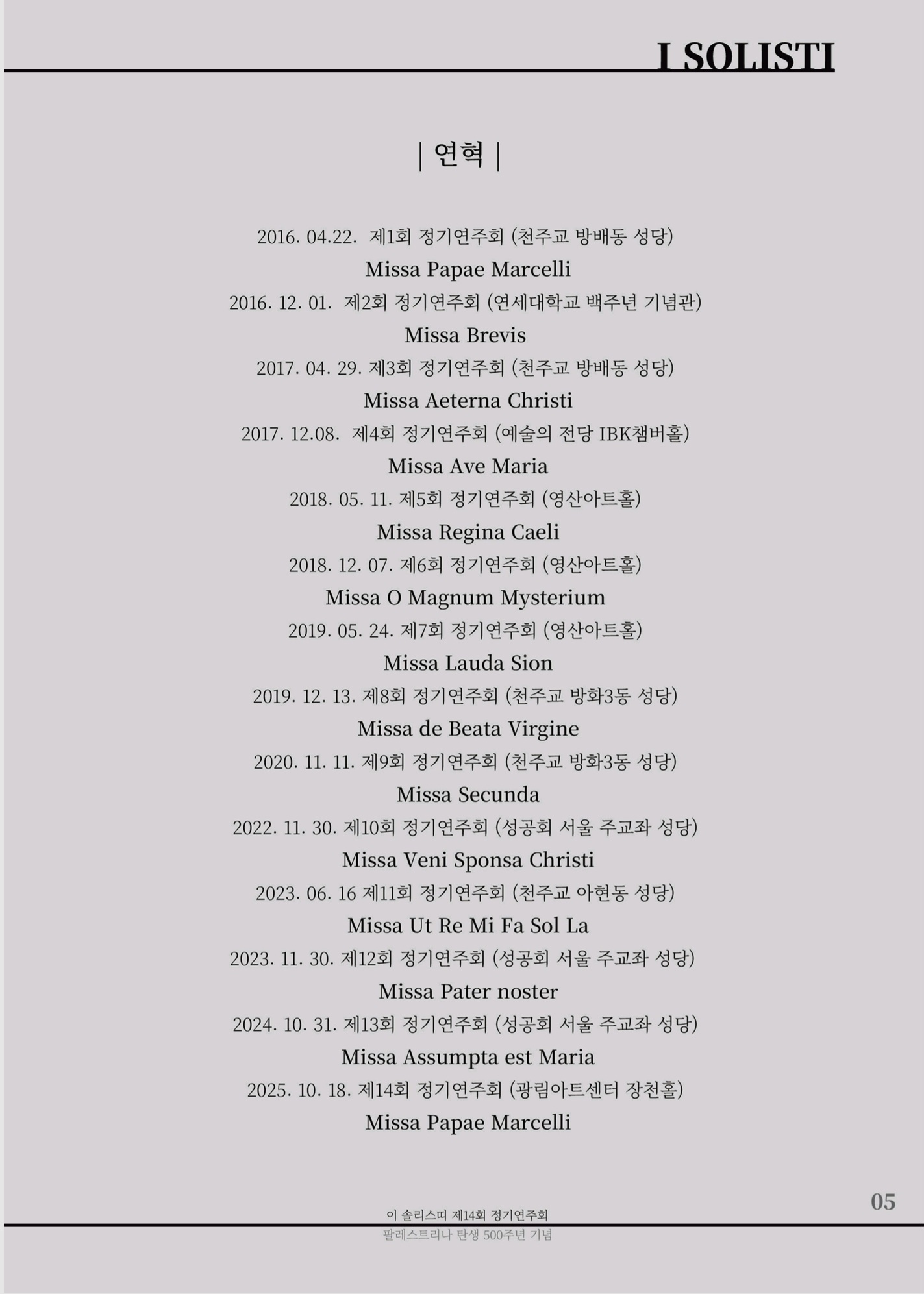 - 이 솔리스띠 제14회 정기연주회 "Missa Papae Marcelli" 프로그램