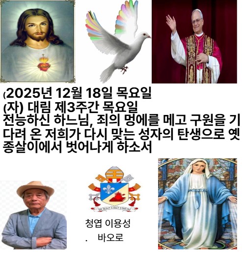 2025년 12월 18일 목요일 (자) 대림 제3주간 목요일 어린양이 오시리라 요한이 선포하였네. 우리 임금님 그리스도 오시리라.