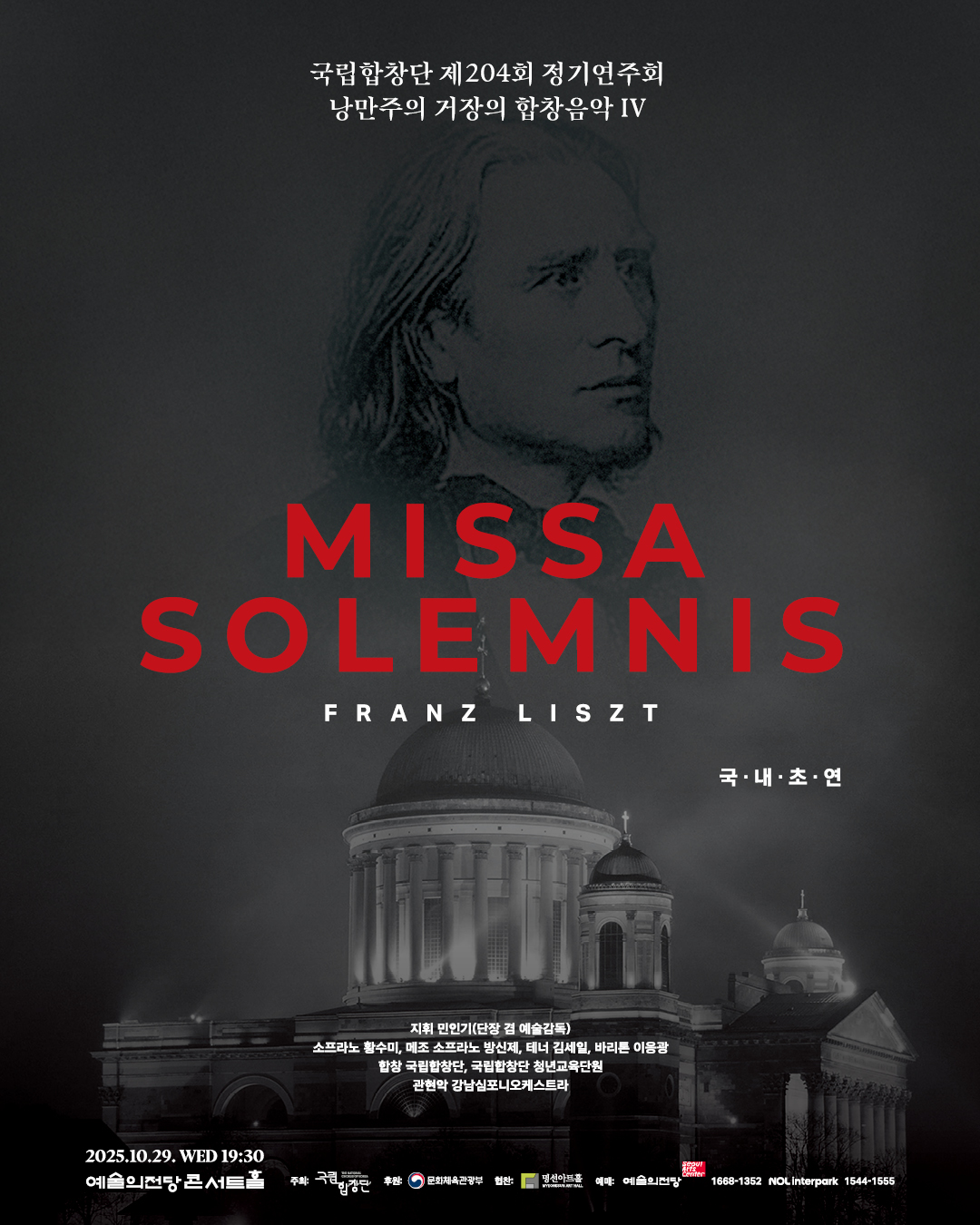 ㅣ공연정보ㅣ 공연명: 국립합창단 제204회 정기연주회 낭만주의 거장의 합창음악 IV <미사 솔렘니스> 날짜: 2025.10.29.(수) 시간: 7:30PM 장소: 예술의전당 콘서트홀 러닝타임: 약 60분(인터미션 없음) 연령: 초등학생 이상 가능 가격: R석 5만원 I S석 3만원 I A석 2만원 예매 문의: 예술의전당ㅣhttps://www.sac.or.kr/site/main/show/show_view?SN=67001 NOL 티켓ㅣhttps://tickets.interpark.com/goods/25003478 공연 문의: 02-580-7032(국립합창단 홍보마케팅팀)