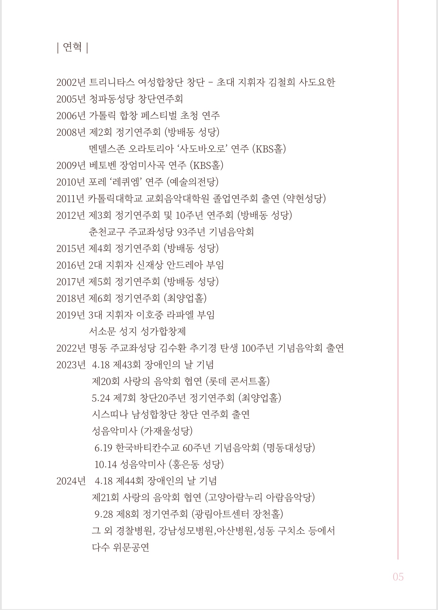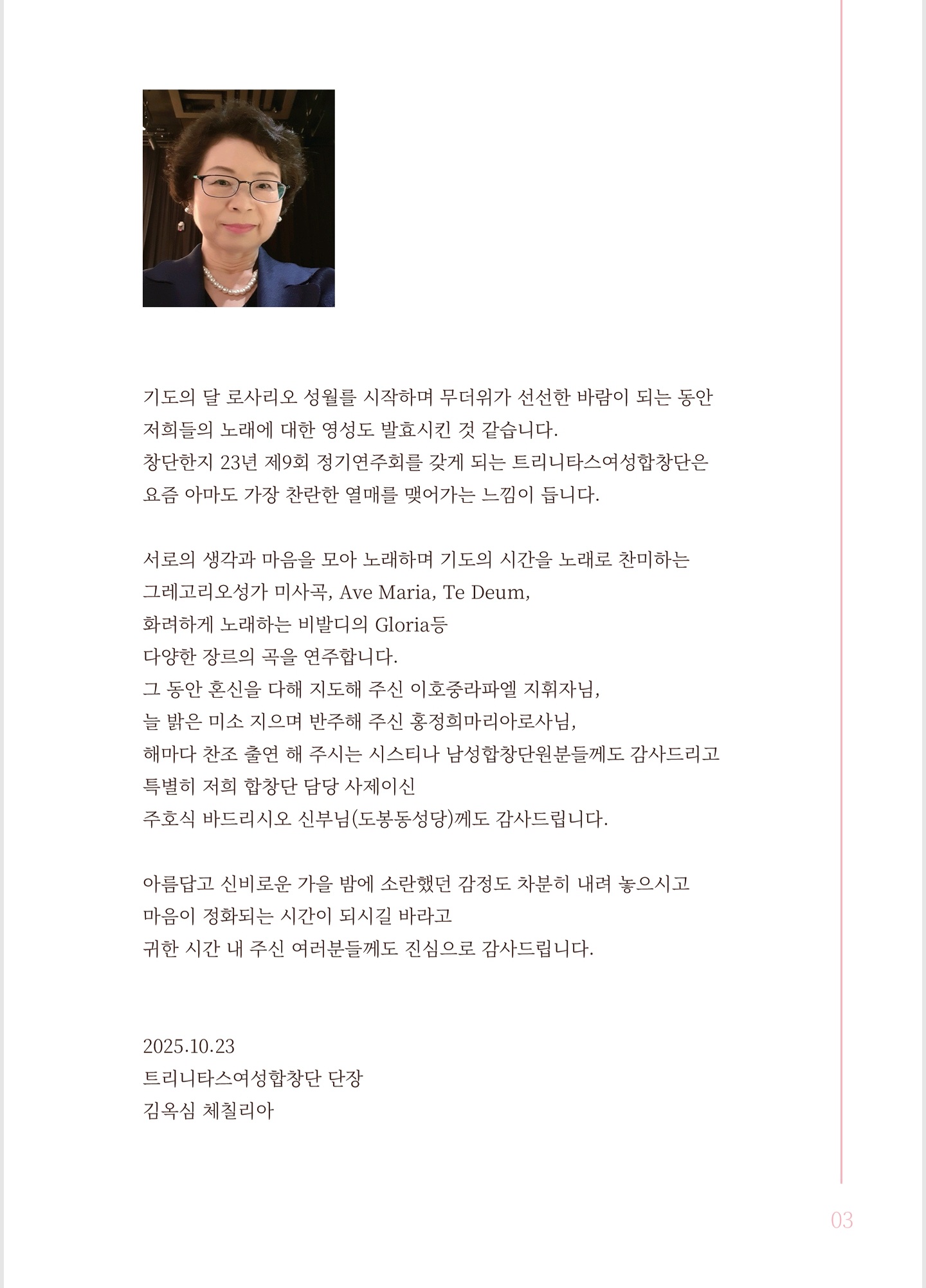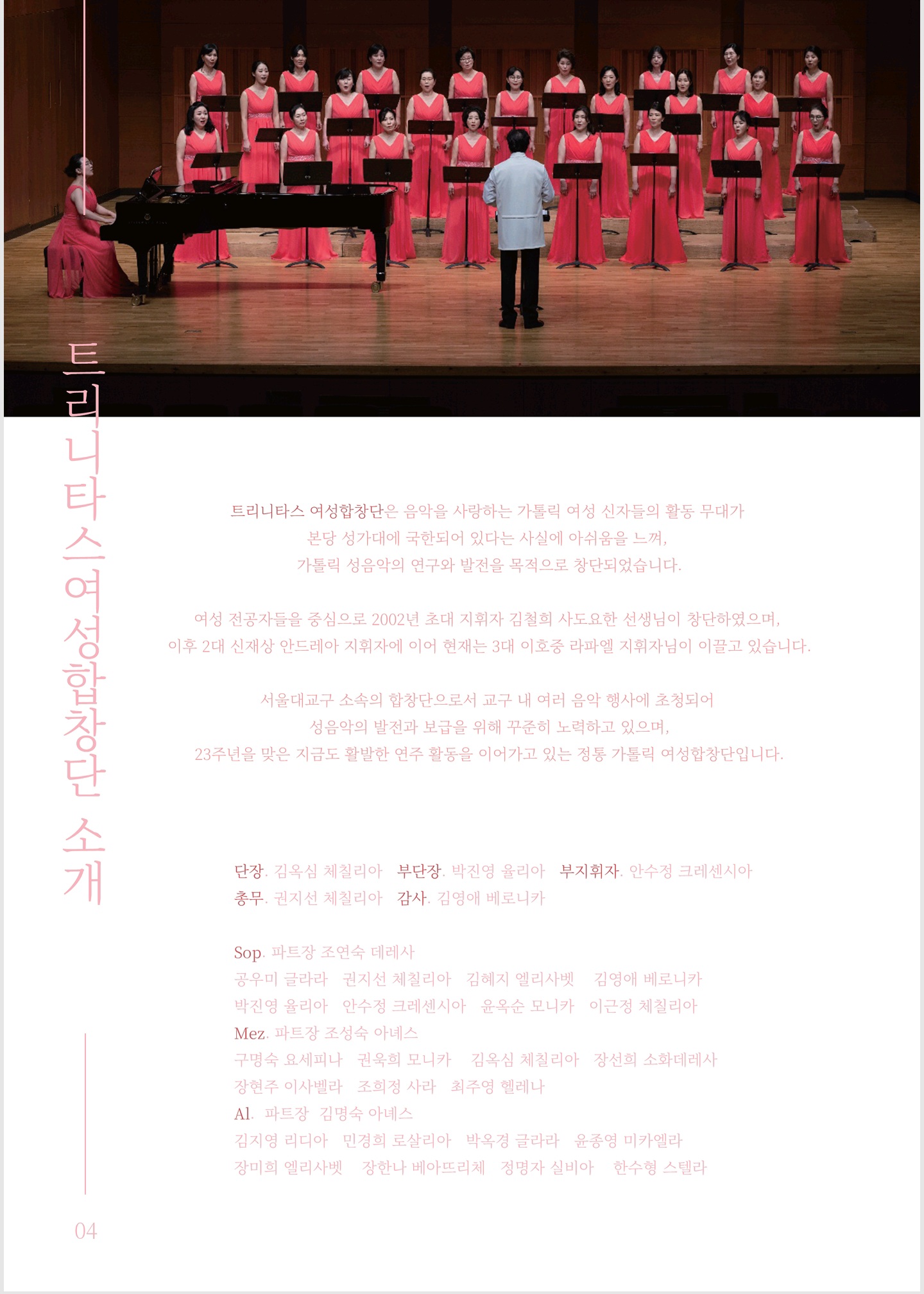 오늘 23일 대한성공회 서울주교좌성당에서 봉헌되는 트리니타스 여성합창단의 제9회 정기연주회 프로그램입니다