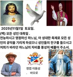 .2025년 11월 01일 토요일 (백) 모든 성인 대축일 오늘은 모든 성인 대축일입니다. 성인들은 하늘 나라에서 하느님을 직접 뵈며 영원한 행복을 누립니다. 하늘 나라의 성인들을 기리며 전구를 청합시다. 예수 그리스도의 죽음과 부활을 굳게 믿는 우리도, 희망을 안고 성인들처럼 하느님을 뵐 그날까지 열심히 살아갑시다.