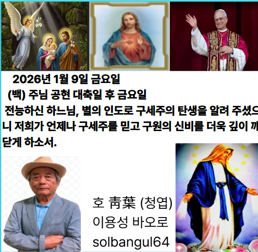 2026년 1월 9일 금요일 (백) 주님 공현 대축일 후 금요일 올곧은 이들에게는 어둠 속에서 빛이 솟으리라. 주님은 너그럽고 자비로우며 의로우시다.