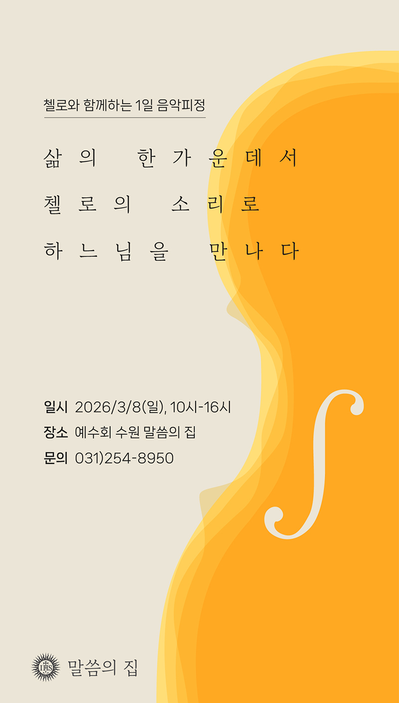 3/8(일) 말씀의 집에서 라이브 첼로연주와 함께하는 일일 음악 피정을 준비했습니다. 관심 있으신 분들의 많은 참여 부탁드립니다.