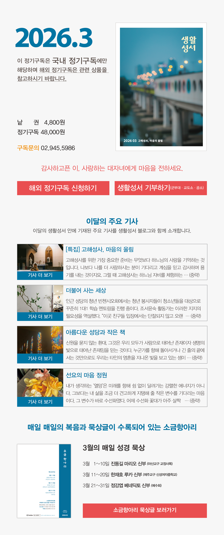 안녕하세요. 생활성서사 입니다. 2026년 3월호와 함께 주님 부활을 기다리며 함께 기도하시길 빕니다. [구독하기]