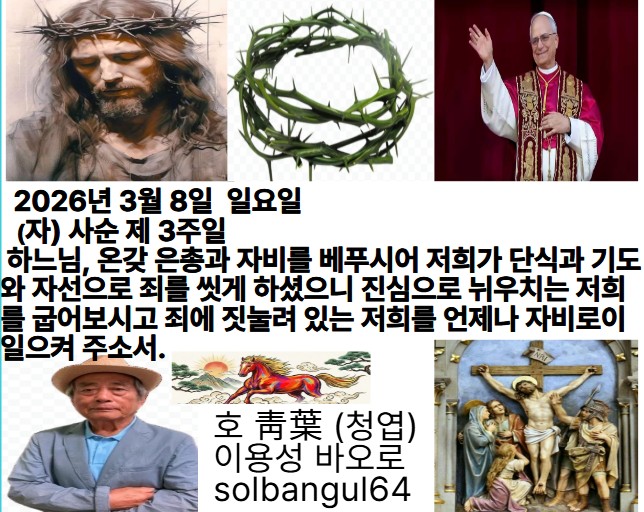 2026년 3월 8일 일요일 (자) 사순 제3주일 오늘 복음에서 예수님께서는 사마리아 여인에게 물을 청하시면서 영원하고 참된 생명의 물에 대한 깨달음을 주십니다. 사순 시기는 주님께서 건네시는 말씀에 더욱 귀 기울이고 그 뜻을 새기는 때입니다. 우리도 사마리아 여인처럼 주님의 말씀을 제대로 알아들을 수 있도록 이 미사에서 열린 마음을 청합시다.