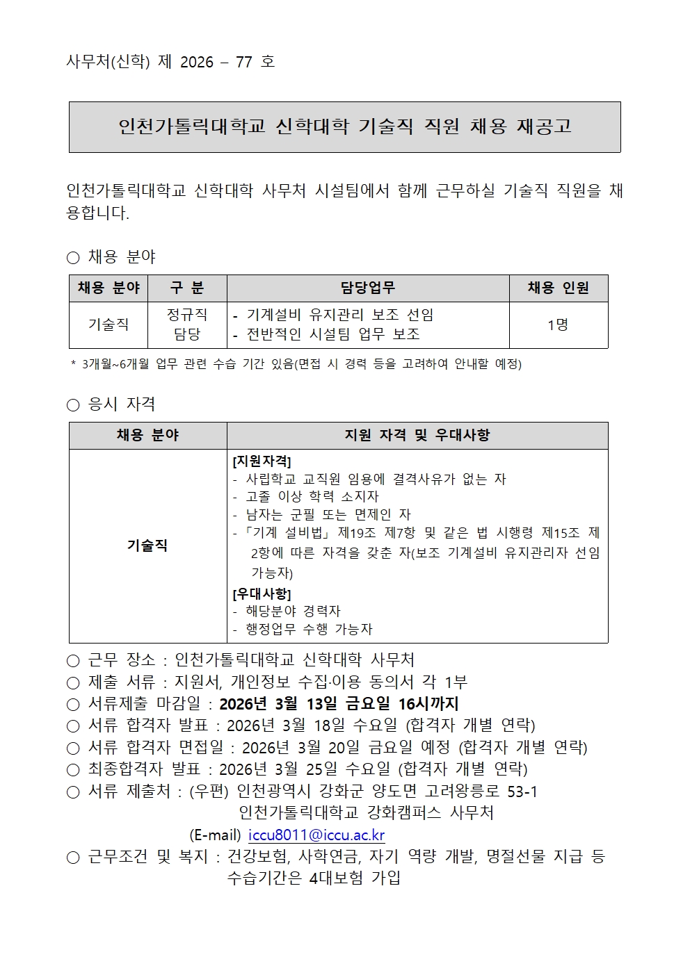 인천가톨릭대학교 신학대학 기술직 직원 채용 재공고문 [기계설비 보조선임]