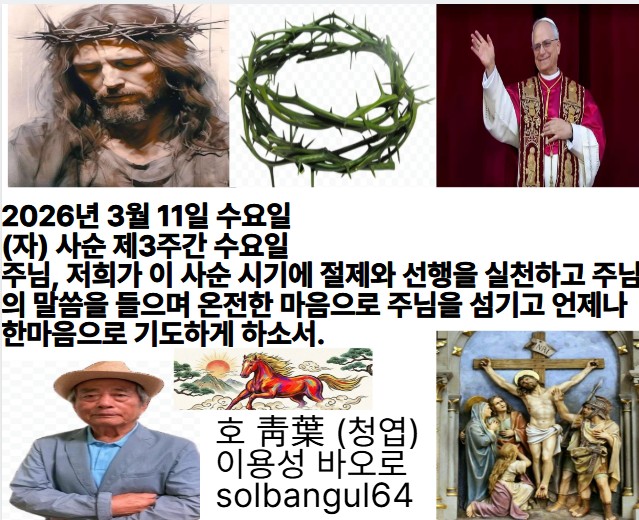 2026년 3월 11일 수요일 (자) 사순 제3주간 수요일 주님 말씀대로 제 발걸음을 굳건히 하시고, 어떠한 불의도 저를 짓누르지 못하게 하소서.