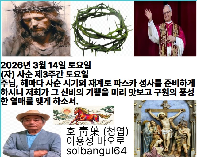 2026년 3월 14일 토요일 (자) 사순 제3주간 토요일 내 영혼아, 주님을 찬미하여라. 그분의 온갖 은혜 하나도 잊지 마라. 주님은 네 모든 잘못을 용서하신다.