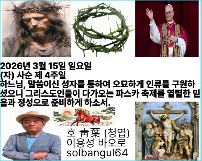 2026년 3월 15일 일요일 (자) 사순 제4주일 오늘은 사순 제4주일입니다. 교회는 오늘 전례에서 부활의 기쁨을 미리 맛보는 기회를 가집니다. 입당송에 나오는 “즐거워하여라, 예루살렘아. ”라는 성경 말씀에 그 정신이 잘 드러나 있습니다. 이 기쁨은 희생과 극기를 실천하며 주님 수난의 길에 기꺼이 함께하려는 이들만이 느낄 수 있는 기쁨입니다. 이 거룩한 미사를 통하여 사순 시기에 요구되는 우리 신앙인의 자세를 더욱 새롭게 합시다.