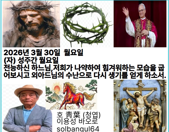 2026년 3월 30일 월요일 (자) 성주간 월요일 주님, 저와 다투는 자와 다투시고, 저와 싸우는 자와 싸워 주소서. 둥근 방패 긴 방패 잡으시고 일어나 저를 도와주소서. 주님, 제 구원의 힘이시여.