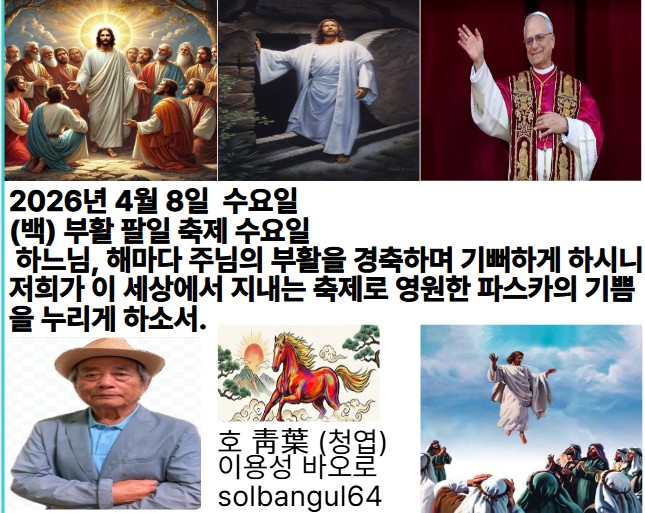 2026년 4월 8일 수요일 (백) 부활 팔일 축제 수요일 내 아버지께 복을 받은 이들아, 와서, 세상 창조 때부터 너희를 위하여 준비된 나라를 차지하여라. 알렐루야.