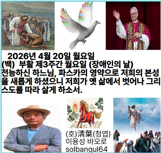2026년 4월 20일 월요일 (백) 부활 제3주간 월요일(장애인의 날) 착한 목자, 당신 양들을 위하여 목숨을 바치셨네. 당신 양 떼를 위하여 돌아가시고 부활하셨네. 알렐루야.