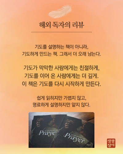 제가 이 책으로 바라는 건 단 한 가지입니다. 여러분이 기도를 배우는 것, 그리고 가장 중요한 건 바로 실제로 기도를 시작하는 것입니다. 여러분 중에 “저는 어떻게 기도하는지 모릅니다.”라고 말하는 분도 있겠지요. 좋습니다. 주님 앞에서 “주님, 저는 어떻게 기도하는지 모릅니다.”라고 말씀드려 보십시오. 그 순간에 바로 당신은 이미 기도를 시작한 것입니다. - ‘서문’에서