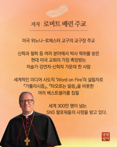 글쓴이 로버트 배런Robert Barron 미국 미네소타의 위노나-로체스터 교구장 주교이다(2022년-현재). 1959년 시카고에서 태어나, 1986년 시카고 대교구에서 사제로 서품되었다. 1992년 파리가톨릭대학교 에서 신학 박사 학위를 받은 후, 2015년까지 먼델라인 신학교에서 교수로 재직했다. 2015년에 주교로 서품되어 로스앤젤레스 대교구 보좌 주교를 역임했다. 가톨릭 미디 어 선교 단체 ‘워드 온 파이어Word on Fire’를 설립하여, 책과 여러 매체로 복음을 전하고 있으며, “교회의 가장 뛰어난 메신저 중 한 사람”이라는 평가를 받았다. 10부작 TV 다큐멘터리 프로그램 「가톨리시즘」의 진행자로 활동했으며, 전 세계 300만 명이 넘는 SNS 팔로워들의 사랑을 받고 있다. 『가톨리시즘』, 『타오르는 말씀』을 비롯한 여러 베스트셀러를 집필한 그는 현재 미국 교회에서 가장 영향력 있는 저술가와 강연자이다. 옮긴이 허찬욱 천주교 대구대교구 사제로 독일 프라이부르크대학교에서 신학 박사(종교 철학 전공) 학위를 받은 후, 대구가톨릭대학교 신학 대학에서 신학생들을 가르쳤다. 지금은 화원 성당 주임 신부로 사목하고 있다.