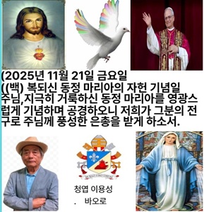 2025년 11월 21일 금요일 (백) 복되신 동정 마리아의 자헌 기념일 이날은 동방 교회의 신자들과 함께, 성모님께서 원죄 없이 잉태되실 때 은총을 가득히 채워 주신 그 성령의 감도로 성모님께서 아기 때부터 하느님께 봉헌되신 것을 기리는 날이다. 성모님의 부모인 요아킴과 안나는 성모님께서 세 살 되시던 해에 성전에서 하느님께 성모님을 바쳤다고 전해 온다. 이날은 본디 6세기 중엽 예루살렘 성전 가까이에 세워진 새로운 성모 성당의 봉헌을 기념하는 날이었는데, 1472년 식스토 4세 교황께서 .