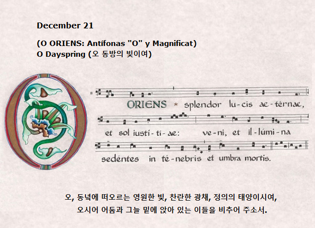 이 마니피캇 안티폰은 수도자들만의 기도처럼 보이지만 누구나 바칠 수 있는 교회의 기도입니다. 대림 시기에는 평신도도 조용히 개인 묵상으로 한 구절씩 읽으며 메시아를 기다리는 마음을 함께할 수 있습니다. 아름다운 기다림의 묵상, 기도입니다.