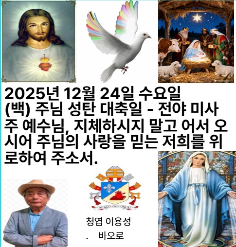 2025년 12월 24일 수요일 (백) 주님 성탄 대축일 - 전야 미사 참으로 기쁜 밤입니다. 오늘 우리에게 한 아기가 태어났습니다. 모든 사람에게 구원을 가져다주는 하느님의 은총이 나타났습니다. 위대하신 하느님이시며 구원자이신 예수 그리스도의 영광이 나타났습니다. 하늘의 군대와 함께 기뻐하며 노래합시다. “ 지극히 높은 곳에서는 하느님께 영광,