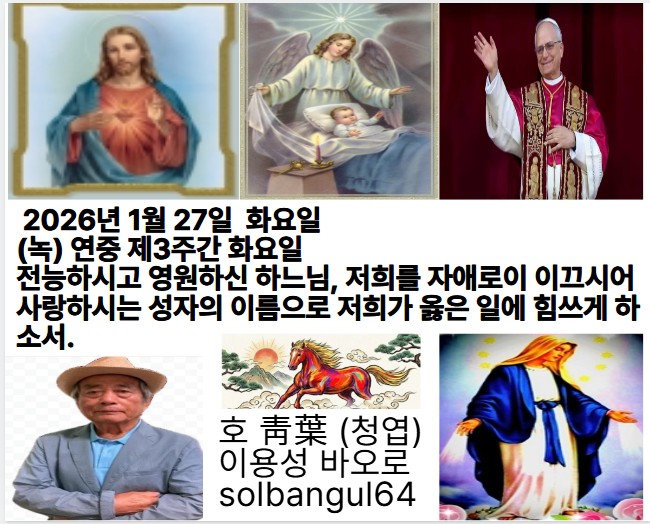 2026년 1월 27일 화요일 (녹) 연중 제3주간 화요일 오늘 전례 [백] 성녀 안젤라 메리치 동정 주님께 노래하여라, 새로운 노래. 주님께 노래하여라, 온 세상아. 존귀와 위엄이 그분 앞에 있고, 권능과 영화가 그분 성소에 있네.