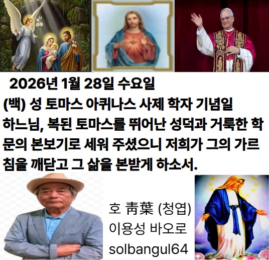 2026년 1월 28일 수요일 (백) 성 토마스 아퀴나스 사제 학자 기념일 토마스 아퀴나스 성인은 1225년 무렵 이탈리아의 한 귀족 가문에서 태어났다. 그는 몬테카시노 수도원과 나폴리 대학교에서 공부하였으며, 가족의 반대를 무릅쓰고 성 도미니코 수도회에 들어가 대 알베르토 성인의 제자가 되었다. 1245년부터 파리에서 공부한 성인은 삼 년 뒤 독일 쾰른에서 사제품을 받고 그곳 신학교의 교수로 활동하였다. 그는 철학과 신학에 관한 훌륭한 저서를 많이 남겼는데, 특히 『신학 대전』 은 그의 기념비적인 저술로 꼽힌다. 1274년에 선종하였으며, 1323년에 시성되었다.