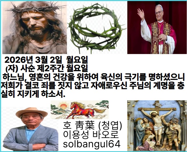 2026년 3월 2일 월요일 (자) 사순 제2주간월요일 주님, 저를 구하소서. 자비를 베푸소서. 제 발은 올바른 길에 서 있나이다. 거룩한 모임에서 주님 찬미하오리다.