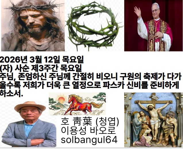 2026년 3월 12일 목요일 (자) 사순 제3주간 목요일 주님이 말씀하신다. 나는 백성의 구원이다. 어떠한 환난 속에서도 부르짖으면 내가 들어 주고, 영원토록 그들의 주님이 되어 주리라.