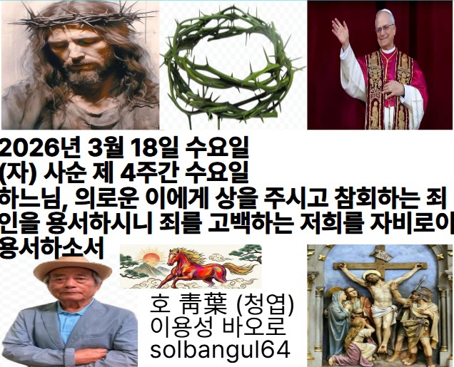 2026년 3월 18일 수요일 (자)사순 제4주간 수요일 주님, 저의 기도가 당신께 다다르게 하소서. 은총의 때이옵니다. 하느님, 당신의 크신 자애로 제게 응답하소서. 당신은 참된 구원이시옵니다.