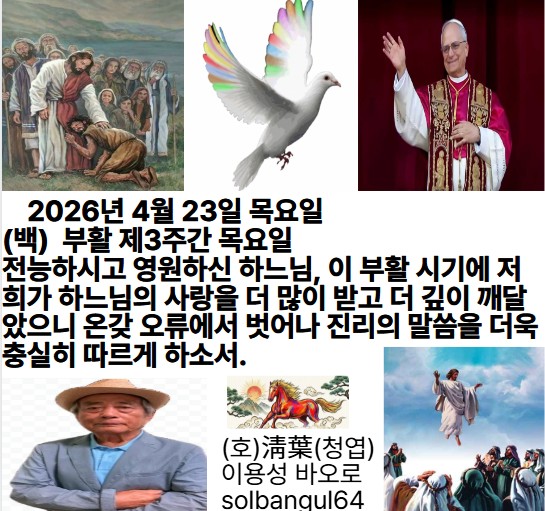 2026년 4월 23일 목요일 (백) 부활 제3주간 목요일) 주님을 찬양하세, 그지없이 높으신 분. 주 님은 나의 힘, 나의 굳셈. 나를 구원하셨네. 알렐루야.