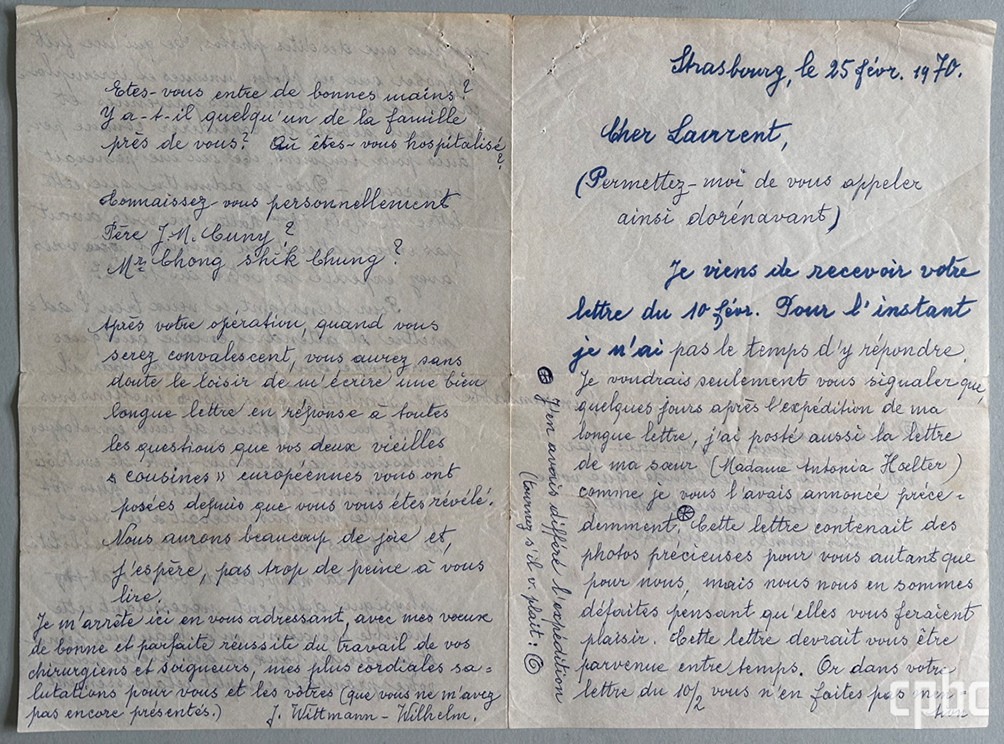 “우리에게도, 라우렌시오(안민생)에게도 똑같이 소중한 사진들을 보냅니다. 당신이 그 사진을 받으면 기뻐하리라 생각하며 우리가 양보했어요.” 비트만 부인은 “옛 한국 친구의 아들과 손자들이 그 시대에서 살아남은 이제 몇 안 되는 우리 노인들에게 기꺼이 연락해주어 기쁘다”고 했다. 13통의 편지는 모두 서로를 궁금해하며 안부를 묻는 내용이다. 당시 수술을 앞두고 있던 안민생의 건강을 걱정하며 수술은 잘 되었는지, 간병할 사람은 있는지를 묻고 병원비에 도움이 될 소액의 돈을 보내고 싶다고도 했다(알자스 로렌 산업은행에서 발행한 송금 증명서도 있다).