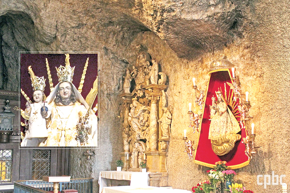 입구 정면 바위 표면에 제대가 있고, 그 옆 돌 속에 화려한 의복에 왕관을 쓴 성모자상이 있습니다. 이 성모상의 정식 명칭은 ‘위로의 어머니’지만, 순례자들은 ‘미소 짓는 마돈나’라고 부릅니다. 후기 고딕 양식의 여느 성모상과 달리 성모 마리아의 입가와 눈가의 미묘한 곡선에서 따뜻함과 친근함을 느끼기 때문입니다. 성모님을 쳐다보면 마치 다정한 미소로 우리 사정을 다 들어주시며 토닥토닥 위로해 주시는 듯합니다.