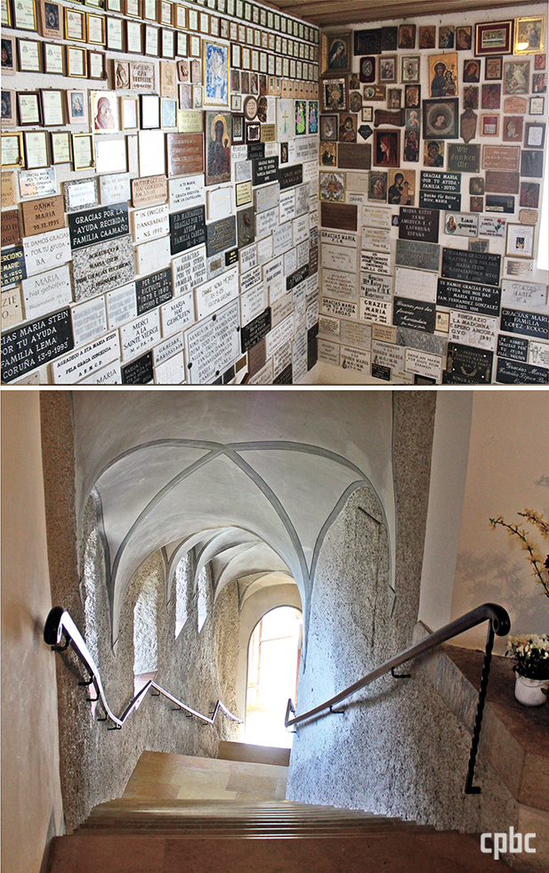 - 순례자들이 봉헌한 감사판(위)과 동굴 소성당으로 내려가는 계단(아래).