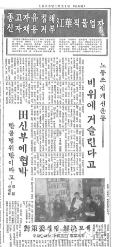 가톨릭시보는 1968년 1월 21자 3면에서 심도직물 사건을 여러 꼭지의 기사를 통해 매우 자세하게 전하고 있습니다.