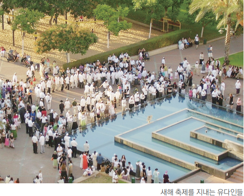 이스라엘의 새해 축제는 우리 설날처럼 즐거운 기간이지만, 심판과 기억의 때이기도 합니다. 전통 유다인들은, 새해가 되면 하느님께서 왕좌에 앉으시어 모든 인간의 행위를 적은 책을 검열하신다고 믿습니다. 한 해 동안 살아온 모습과 그 결과에 따라 선인과 악인 그리고 중간 단계로 나누어 심판하신다고 봅니다. 그래서 유다인들은 새해가 되면, 서로 [하티마 토바] 곧 ‘좋은 결과를 바랍니다.’ 하고 축복해 줍니다. 이는 심판에서 좋은 결과를 얻어 복이 넘치는 새해를 맞으라는 기원입니다. 그리고 새해 첫날 오후에는 지난 해 동안 지은 죄를 씻는다는 의미로 흐르는 물에 손을 담그거나 빵 조각 혹은 돌멩이를 던져 넣기도 합니다(사진 참조).