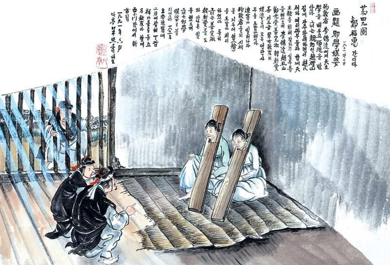 - 부녀자들에게 사학(천주학)을 퍼뜨린 죄로 형조에 갇힌 정복혜 칸디다 모습을 그린 그림. (탁희성 화백, 절두산 순교성지 제공)
