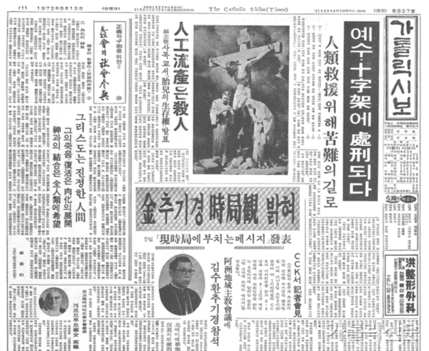 - 김수환 추기경의 ‘현 시국에 부치는 메시지’가 보도된 지면이 정부 당국에 의해 배포 금지된 뒤, ‘예수 수난기’를 1면 톱기사로 게재한 가톨릭시보 1972년 8월 13일자 두 번째 신문 1면 지면. 가톨릭신문 자료사진