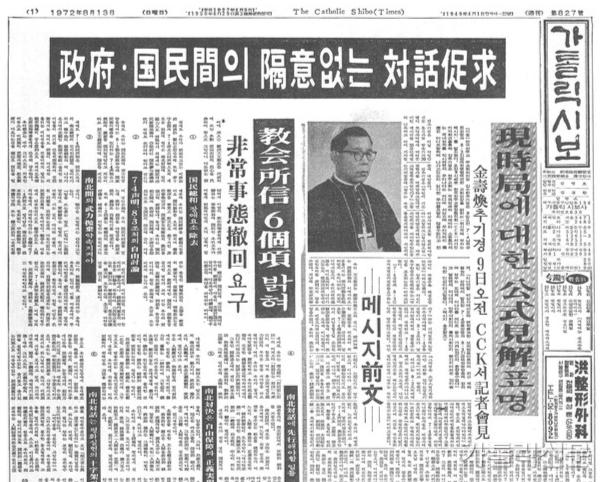 - 김수환 추기경의 ‘현 시국에 부치는 메시지’ 보도와 메시지 전문이 실렸던 가톨릭시보 1972년 8월 13일자 지면. 안타깝게도 이 신문은 정부 당국의 강제로 독자들에게 배포되지 못했다. 가톨릭신문 자료사진