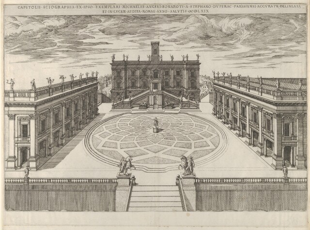 - 미켈란젤로가 설계한 캄피돌리오 광장과 세 건물의 조감도, 1569년 판화. 출처 위키미디어