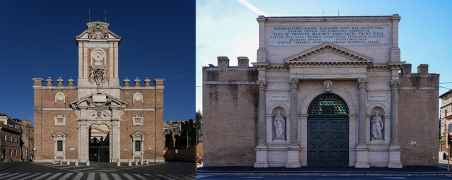 - (왼쪽부터) 포르타 피아 내외부 쪽 파사드. 출처 위키미디어