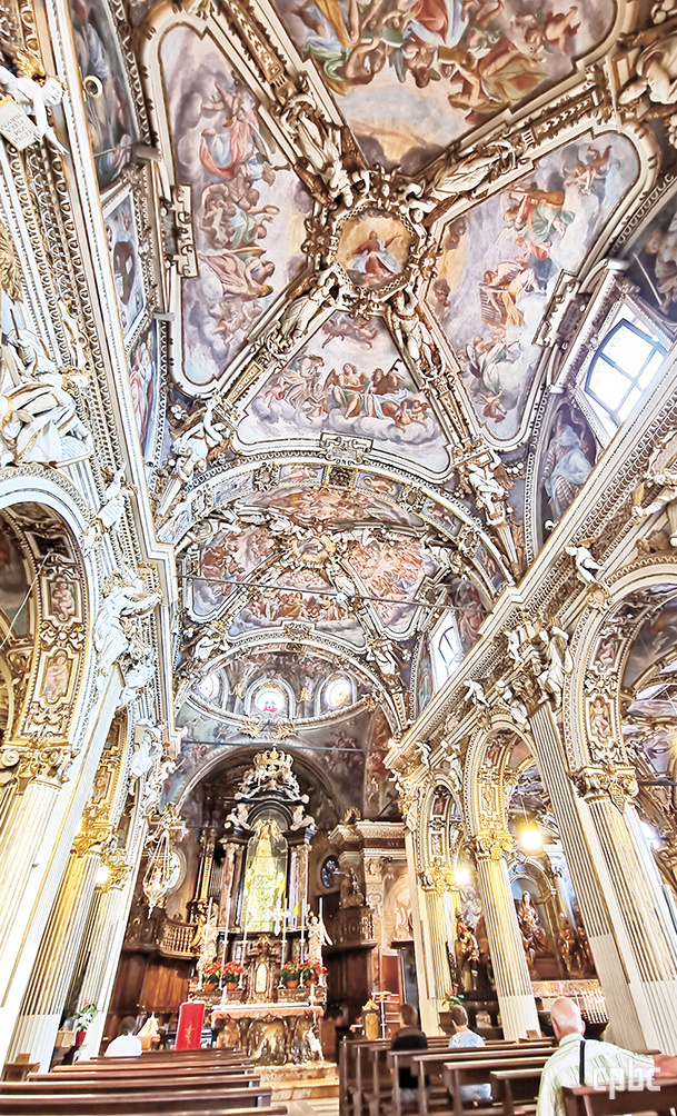 - 산타 마리아 델 몬테 성당. 사크로 몬테 조성 시 세 개의 내진을 가진 구조로 증개축하며 바로크 양식으로 재단장했다. 주 제대의 성모상은 14세기 캄피오네 유파의 작품이지만, 1662년 조각가 주세페 루스나티가 영광의 신비 제5단 천상 모후의 관을 쓰시는 성모님을 주제로 주 제대를 새롭게 만들었다. 제대 위 천장화는 살바토레 비안키의 손길로 완성됐다.