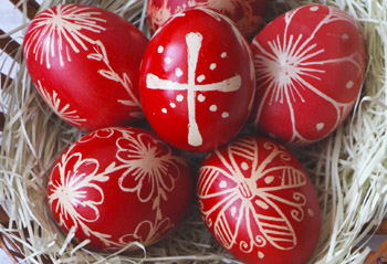 그리고 동방 정교회에는 이런 이야기가 전해 온다. 마리아 막달레나가 예수님께서 부활하신 뒤 로마 제국의 티베리우스 황제가 주최한 연회에 초대받았다. 그 자리에서 그는 흰 달걀을 손에 들고서 황제에게 “그리스도께서는 부활하셨습니다!”라고 외쳤다. 그리스도가 죽었다가 되살아나는 것은 흰 달걀이 붉게 변하는 것만큼이나 가당치 않은 일이라고 황제가 대꾸하는 순간, 마리아 막달레나의 손에 들려 있던 흰 달걀은 밝고 선명한 빨간색으로 변했다.