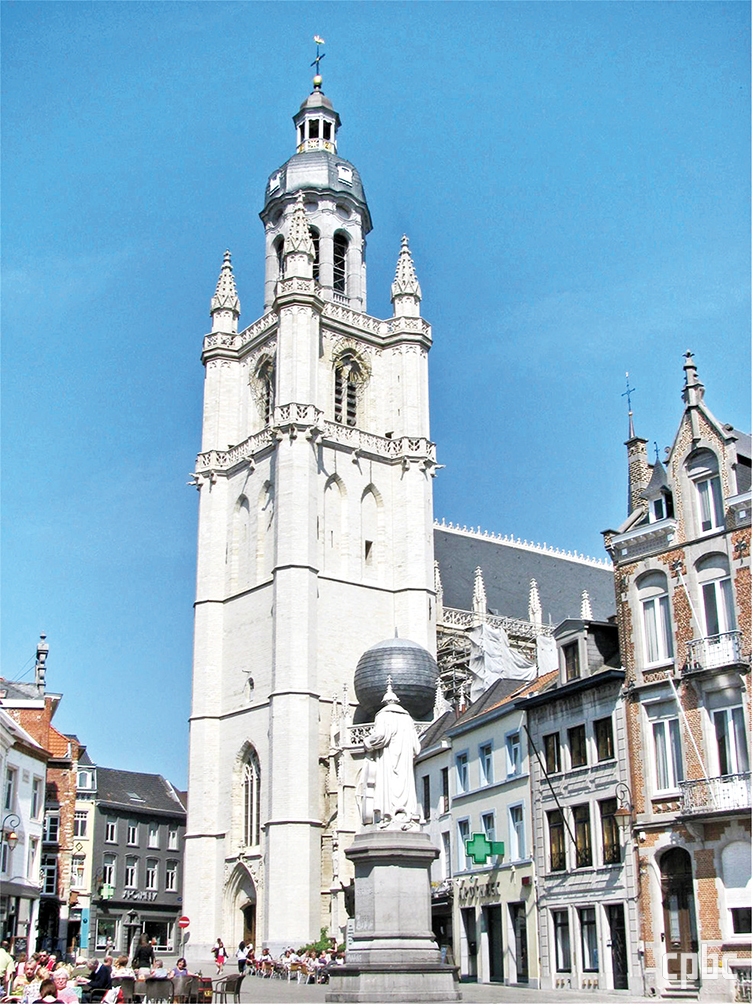 시청 맞은 편에 회백색 사암의 묵중한 종탑이 햇빛을 받아 밝게 빛납니다. 14·15세기 지어진 고딕 양식의 성 마르티노 바실리카입니다. 종탑 옆에 공 모양의 슬레이트로 덮인 구조물은 세례 당의 탑 역할을 합니다. 브라반트 고딕 언어로 세례로 세상을 구원한다는 의미를 표현하려 한 것 같습니다. 탑 내부로 들어가는 길이 외부인에게 알려지지 않은 미로여서 실제 제2차 세계대전 중 독일군에게 쫓기던 사람들을 구원하는 은신처가 되기도 했습니다.