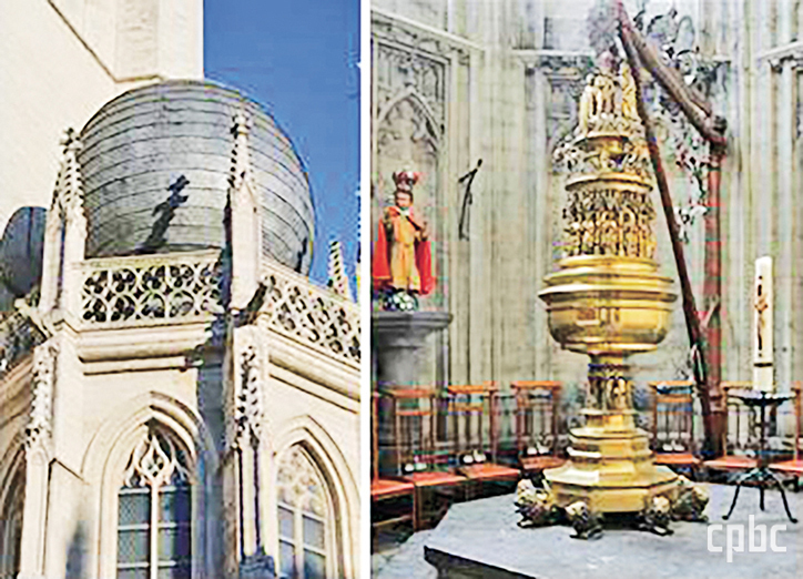 - 세례당의 공 모양 탑과 세례대. 구체는 1440년경 제작된 것으로 뒤편 장식벽 뒤 남쪽 통로 다락방을 지나 성당 밖으로 나간 뒤 들어갈 수 있다. 제2차 세계대전 당시 독일군은 이를 몰라 사람들이 이곳에 몸을 숨기기도 했다.