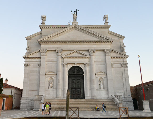 - 레덴토레 성당 파사드. 산 조르조 마조레 성당에서 보여준 바실리카 형태의 공간과 고대 로마의 신전 파사드를 결합하는 팔라디오의 해결책은 레덴토레 성당 파사드에서 한 단계 더 발전한 모습을 보인다. 출처 위키미디어
