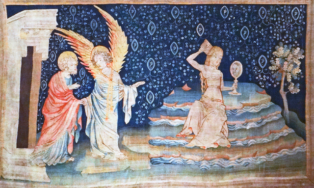 - 프랑스 앙제 성(城)에 전시된 요한 묵시록 태피스트리 중 <바빌론의 대탕녀>(부분). 위키미디어