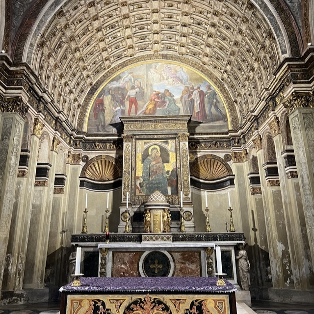 브라만테가 설계한 밀라노의 ‘산타 마리아 프레소 산 사티로 성당’을 순례하였을 때의 일입니다. 이 성당은 제단의 뒤편에 길이 있어서 앱스 공간을 제대로 만들 수 없었습니다. 그래서 브라만테는 투시도법으로 앱스를 그려 넣어서 앱스가 있는 것처럼 만들었습니다. 따라서 이 성당 순례의 묘미는 눈에 보이는 앱스와 실제의 앱스를 확인하는 것입니다.